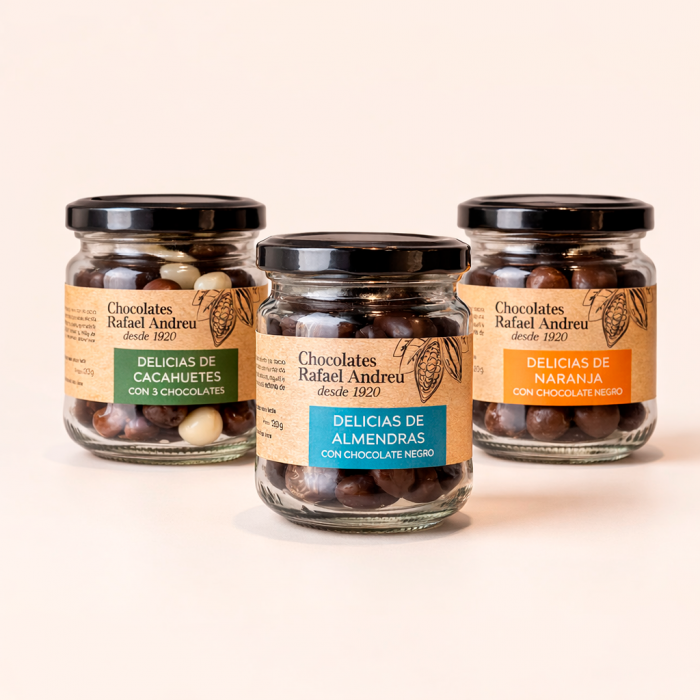 Botes de bombones de chocolate Rafael Andreu, maestro chocolatero desde 1920. Tres deliciosas variedades: almendras con chocolate negro, naranja con chocolate negro y cacahuetes con tres chocolates. Un capricho dulce perfecto para regalar, compartir o disfrutar con el café.